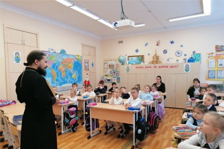 Урок приобрёл особую атмосферу благодаря визиту почётного гостя иерея Виталия Тимофеева, клирика храма Воскресения Христова города Чебоксары.