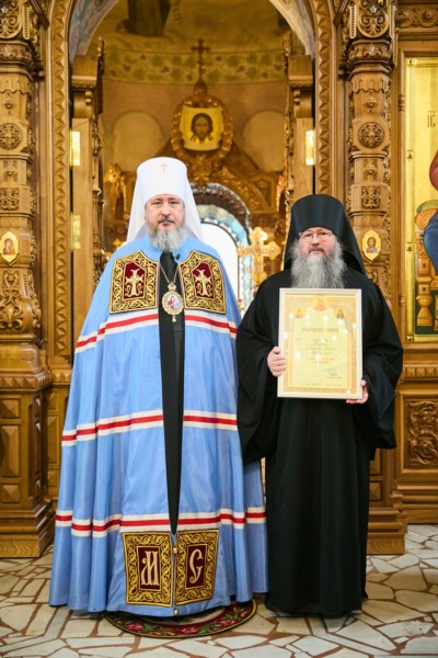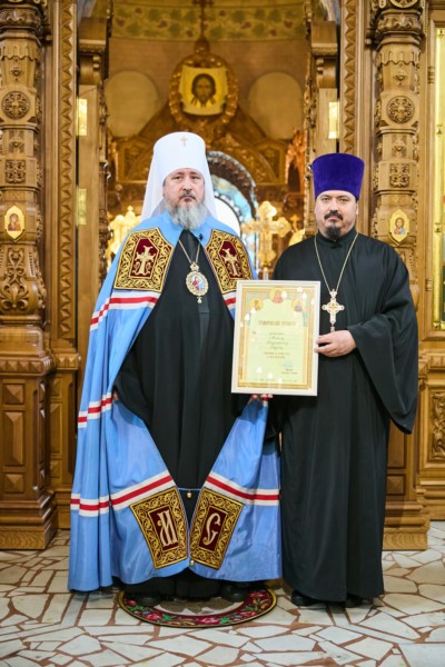 Во внимание к педагогическим трудам и в связи с 30-летием со дня возрождения Чебоксарского духовного училища вручил преподавателем Центра подготовки црковных спецмалистов Чувашской митрополии Архиерейские грамоты: иеромонаху Феодосию (Аксенову) настоятелю храма Владимирской иконы Божией Матери с. Анат-Киняры Чебоксарского муниципального округа и протоиерею Максиму Зарубину настоятелю храма Воздвижения Креста Господня с.Красные Четаи Красночетайского муниципального округа.