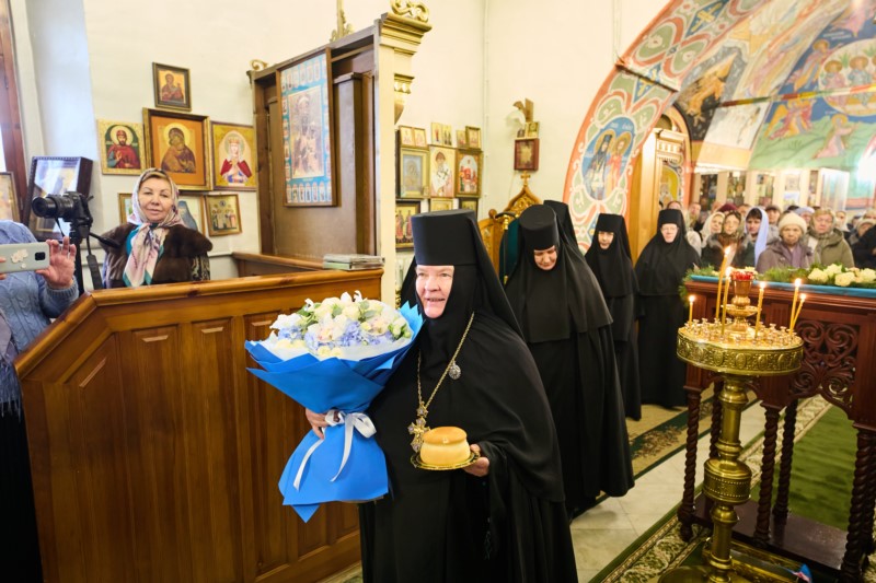 По окончании богослужения настоятельница монастыря игумения Сергия (Рузавина) поздравила митрополита Савватия с двунадесятым праздником, пожелала Владыке духовных и телесных сил в архипастырских трудах и приподнесла заздравную просфору и букет цветов.