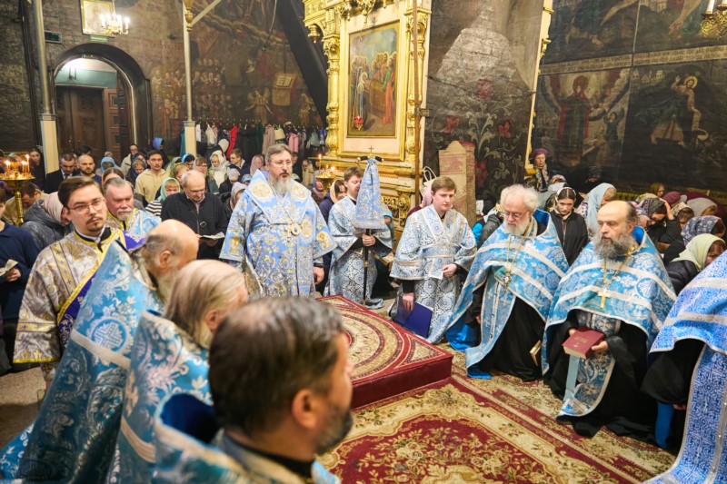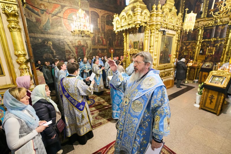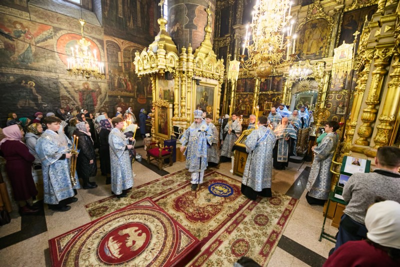 По сложившейся традиции кафедрального собора первая часть акафиста Пресвятой Богородице читалась в центре храма перед иконой "Похвала Божией Матери", вторая часть в южной части храма перед чтимой иконой Пресвятой Богородицы «Семистрельная», третья перед иконой Божией Матери "Достойно есть" в северной части храма, а чтение заключительной части акафиста совершалось вновь перед иконой в центре собора.