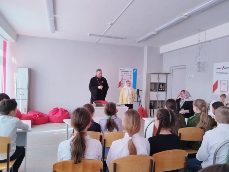 На встречу с учениками разных возрастов и педагогами пришёл особый гость — иерей Илия Лебедев. Он является директором Центра подготовки церковных специалистов имени свт. Гурия Казанского, председателем Комиссии по канонизации святых Чувашской митрополии и Епархиального отдела по миссионерскому служению, а также настоятелем храма Успения Пресвятой Богородицы в селе Акулево.