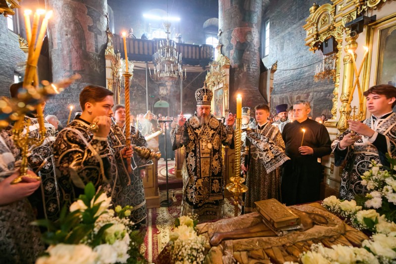 После того, как Святая Плащаница была изнесена из алтаря на середину храма с проповедью обратился митрополит Чебоксарский и Чувашский Савватий.