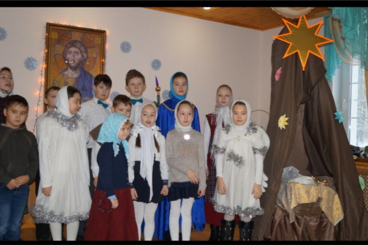 8 января после Божественной Литургии детвора собралась в актовом зале для того, чтобы прославить Рождество Богомладенца. Вначале настоятель храма протоиерей Александр Панзин поздравил всех присутствующих с одним из главных христианских праздников, установленных в честь рождения во плоти Иисуса Христа. После общего исполнения Рождественского Тропаря на сцену вышли самые маленькие участники праздника - младшая группа "Зернышки", которые исполнили веселые песни.