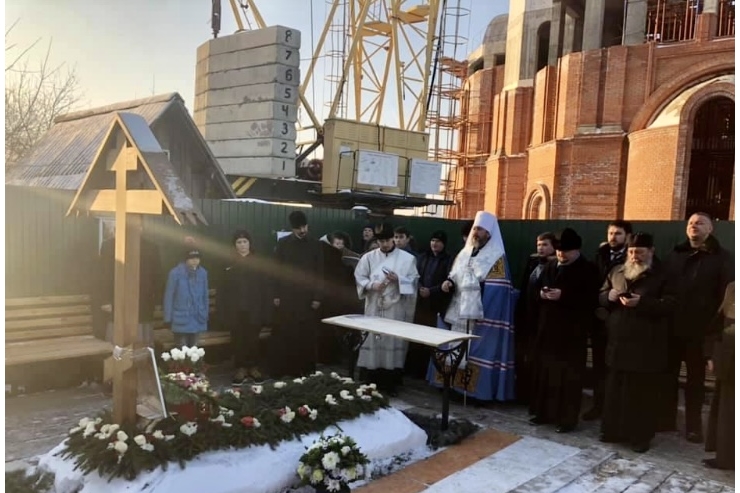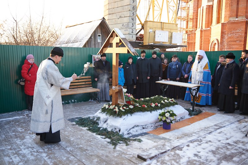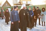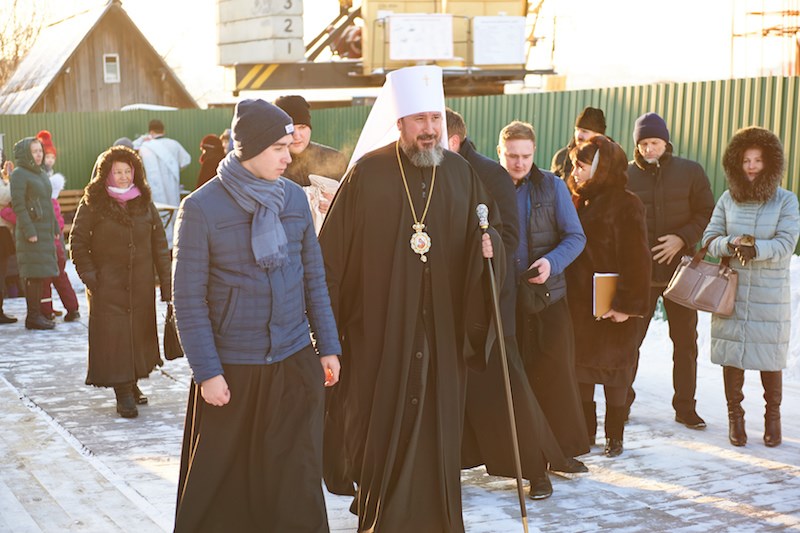 По окончании богослужения владыка обратился к собравшимся с архипастырским словом и затем ознакомился ходом строительства храма.