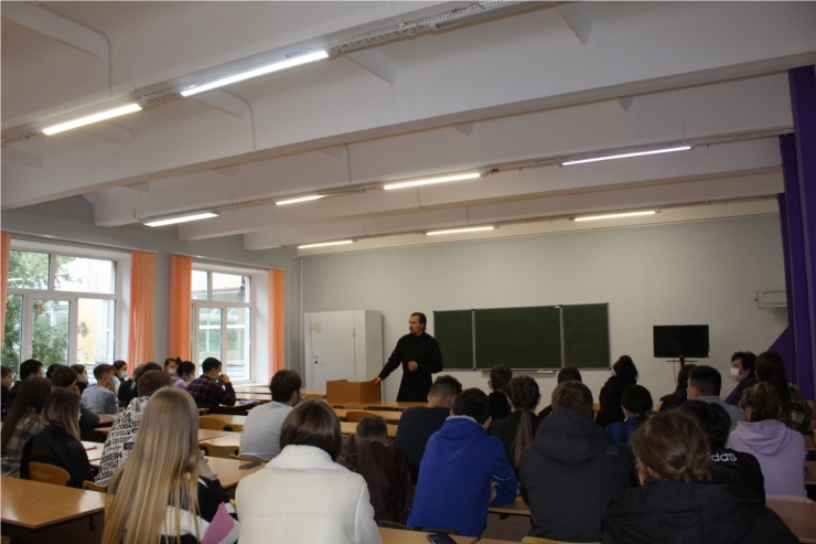 Отец Максим доступным и понятным языком старался донести студентам информацию о православном мировозрении, о том, что цели и стремления, идеалы, заложеные в Православии, призваны формировать человека как цельную достойную личность. Принципы Православия нацелены на мир и гармонию, любовь к ближнему и помощь нуждающемся.