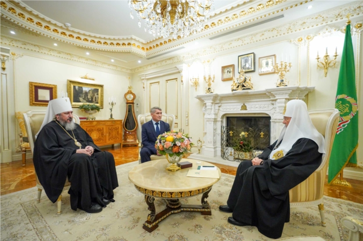 Состоялась встреча Святейшего Патриарха Кирилла с главой Чувашской Республики О.А. Николаевым и митрополитом Чебоксарским Савватием