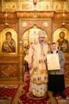 По окончании Литургии настоятель обители от лица братий монастыря приветсвовал Владыку митрополита с праздником и приподнес заздравную просфору и корзину цветов.