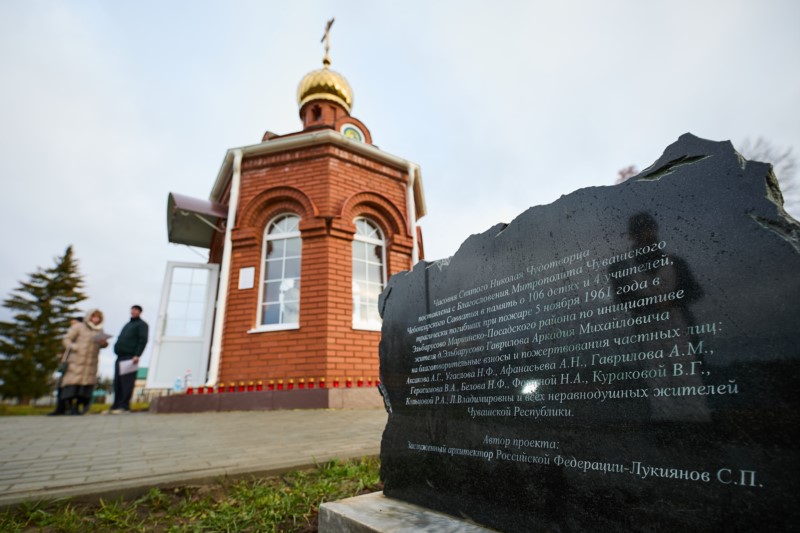 Освятив часовню, владыка митрополит обратился к присутствующим с призывом сохранять память об этой трагической истории, передавать её от поколения к поколению, чтобы избежать повторения. Глава Чувашской митрополии наградил архиерейской грамотой Аркадия Михайловича Гаврилова, участника трагедии, выжившего в пожаре и ставшего инициатором строительства часовни. Его трудами были собраны средства и возведено здание часовни.